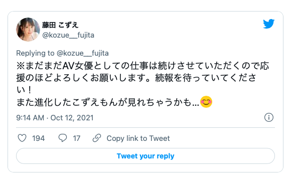 她自己是蛮看得开的,除了感谢S1自出道以来的照顾外也说了不会引退,还要大家好好看看自己的成长ー所以我常说这一行真的不是一分努力一分收穫,论认真藤田こずえ(藤田梢)应该是同期新人中数一数二的好学生,社群更新得快又多而且还努力想梗,社群交出的成绩单也不错,但和同期的はやのうた(早野诗)就稍微差了些⋯