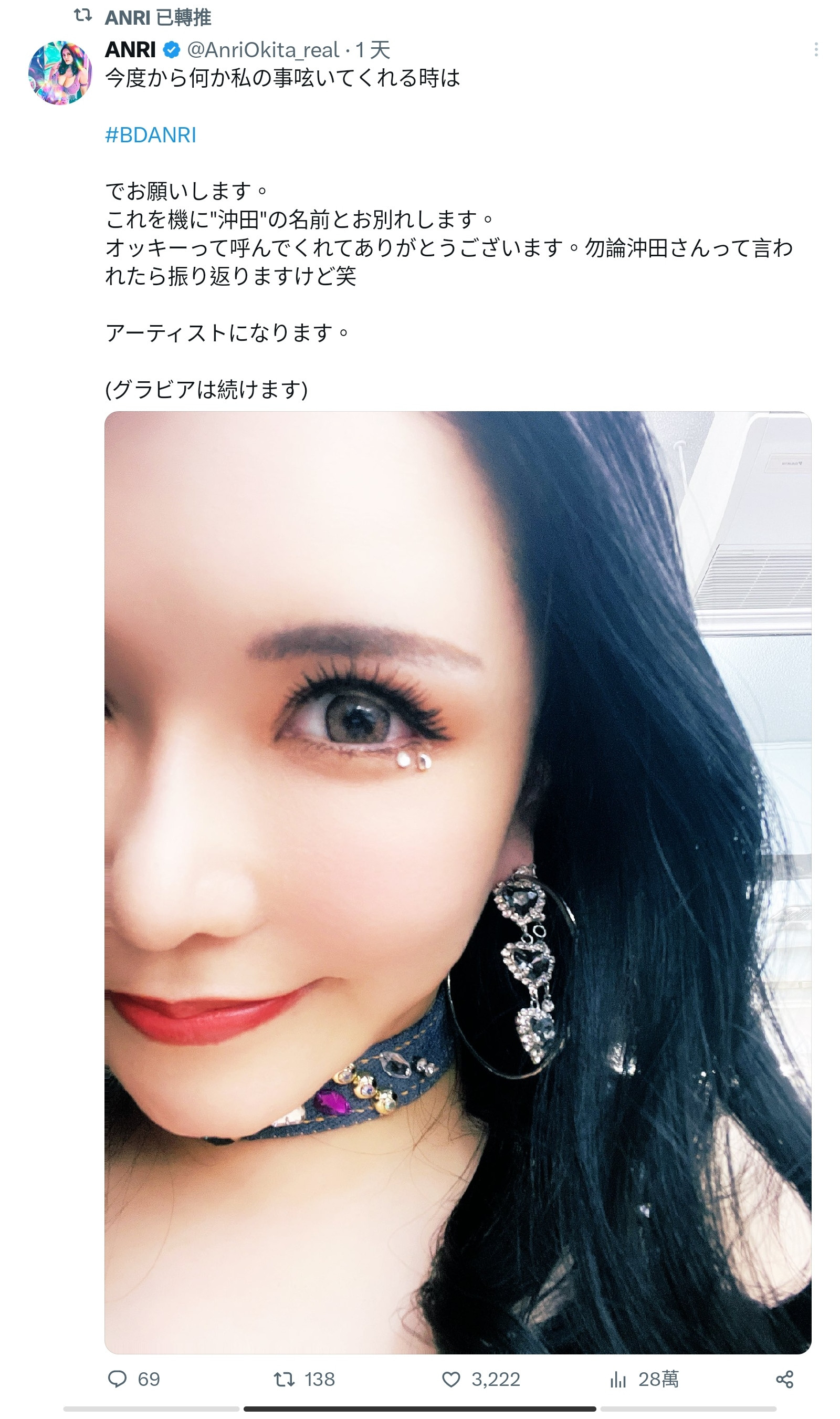 为什么?冲田杏梨之前的事务所说并没有要求必须改名,而是ANRI顺势拿到这个陪伴自己到现在的艺名以示追逐梦想全力发展艺人工作的决心(偶像团体、写真、付费粉丝团)ー坦白说,看到佐山爱和ANRI两位成员时我实在蛮惊讶,一般这种年纪的女优大多藏龙藏到能不公开露面就不要,想不到这两位女优竟然愿意和年轻人一起唱唱跳跳,真是太热血啦〜