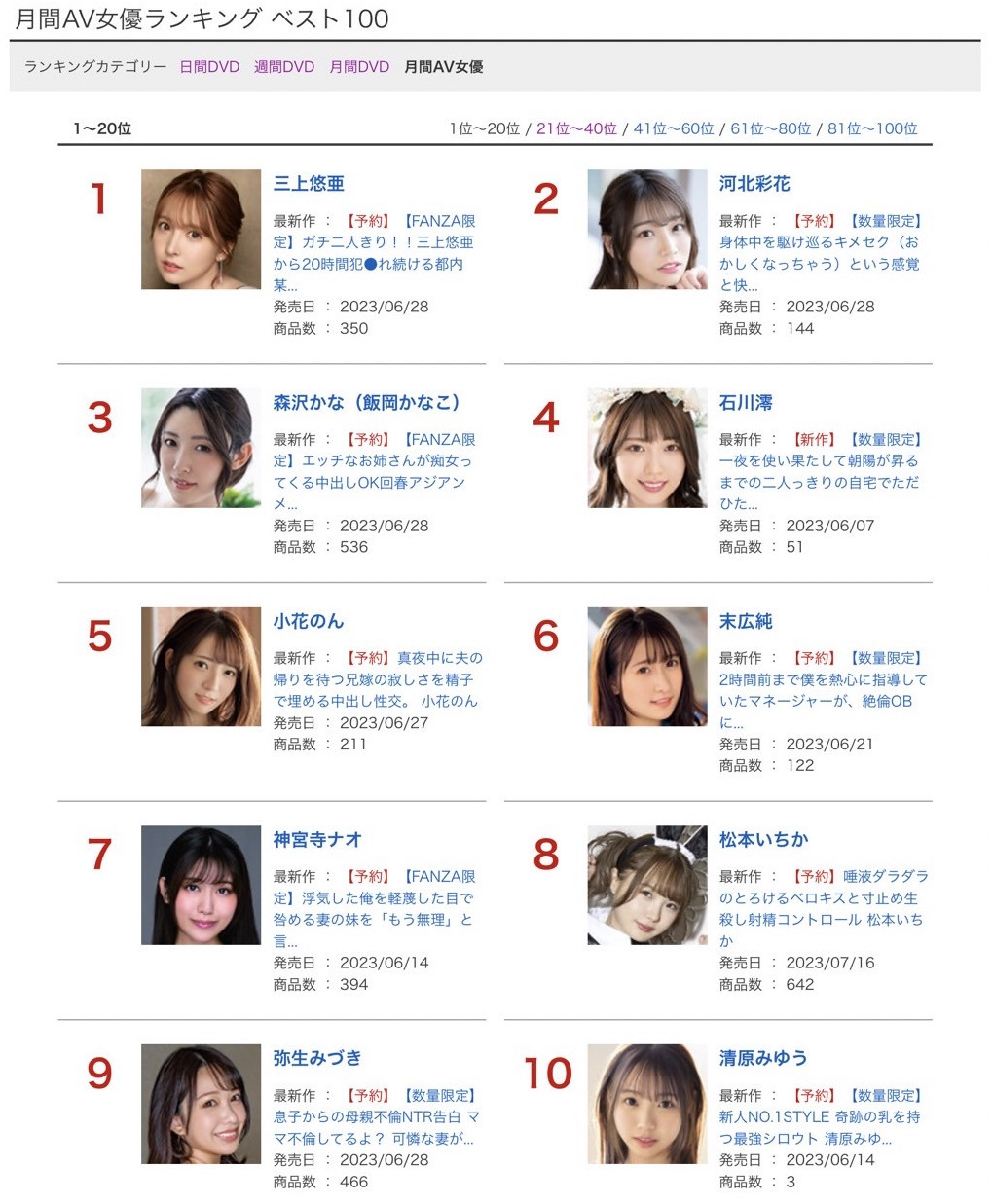 接下来让我们来看看在三上的荼毒下,还有哪些女优能打进销售排行榜前十名吧:首先是两位新人,一位是茉城まみ(茉城麻美),先别说她所属的FALENO STAR很会在FANZA的实体DVD通贩排行榜名列前茅了,她在出道前在杂志拍摄写真造势、童颜巨乳的外型甚至有办法与海外影迷直接用中文交流都让她一出道就气势如虹,虽然能维持多久不知道,但至少好的开始是成功的一半;而另一位清原みゆう(清原美优)则是S1近期销售成绩表现最好的新人,为什么呢?因为她奶好大奶好大奶好大,看到她那么膨胀,大家自然就愿意买支持给她机会: